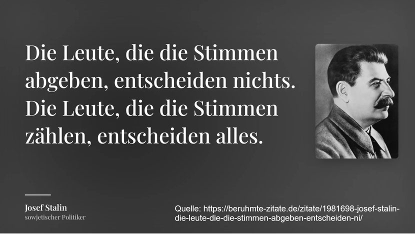 entscheiden alles.“ (Quelle: https://beruhmte-zitate.de/zitate/1981698-josef-stalin-die-leute-die-die-stimmen-abgeben-entscheiden-ni/) Das Original aus der Politbürositzung vom Dezember 1923 soll