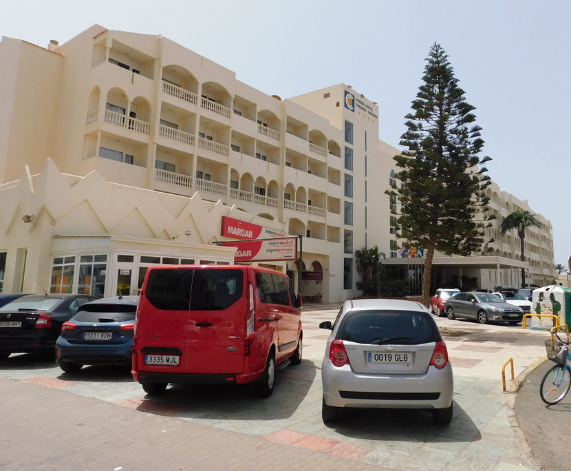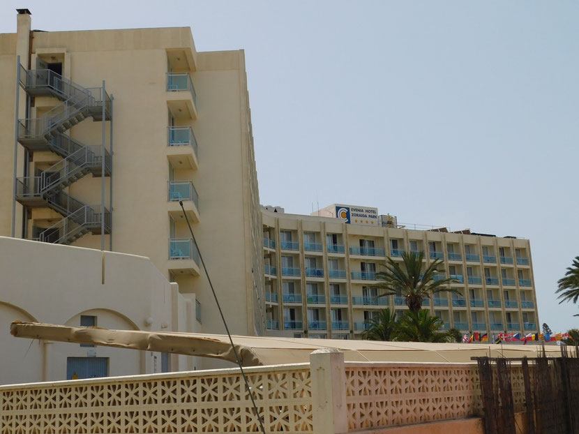 zwei Hotels am Strand, Läden und Restaurants gegenüber